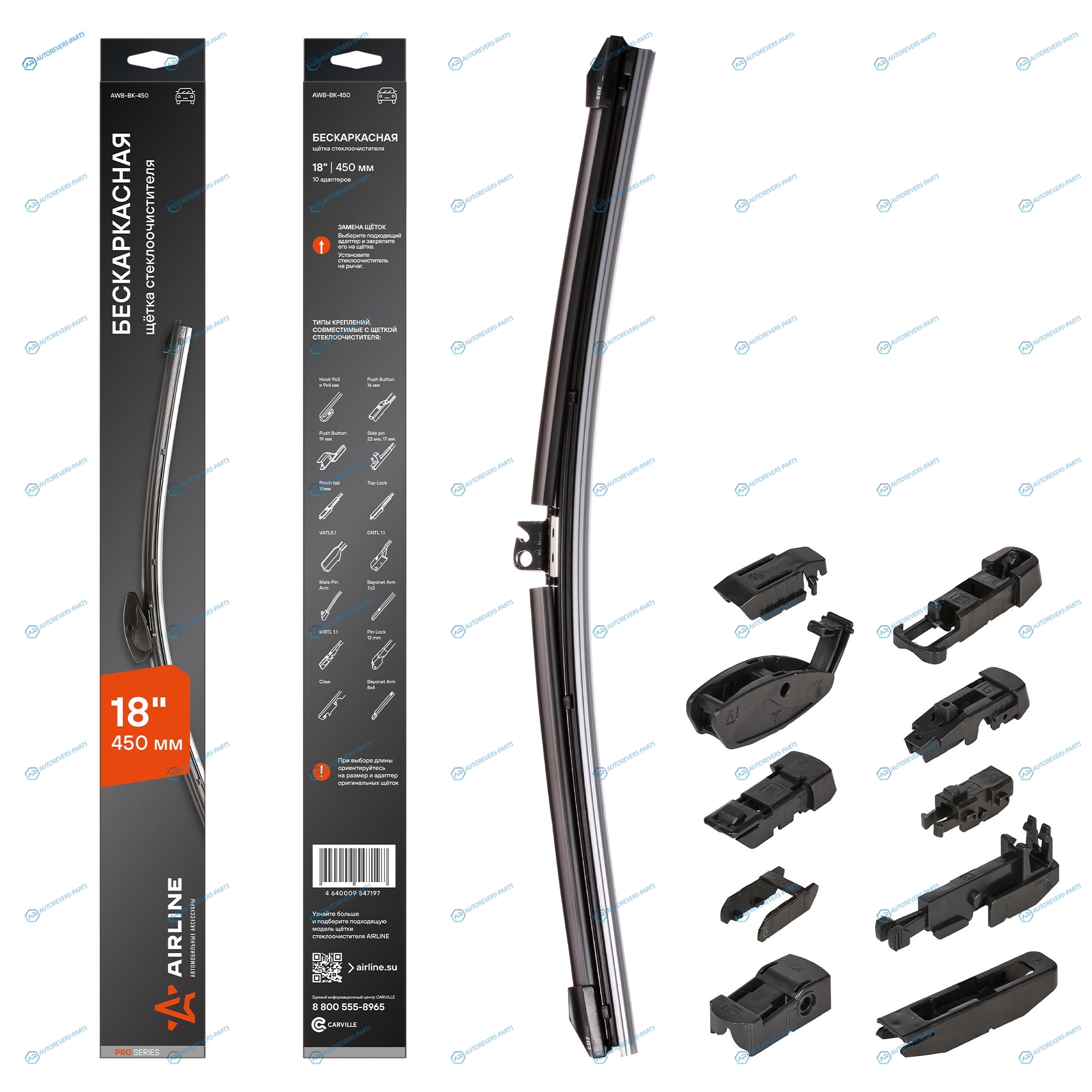 AWB-BK-450 Щетка стеклоочистителя 450 мм (18) бескаркасная. 10 адаптеров