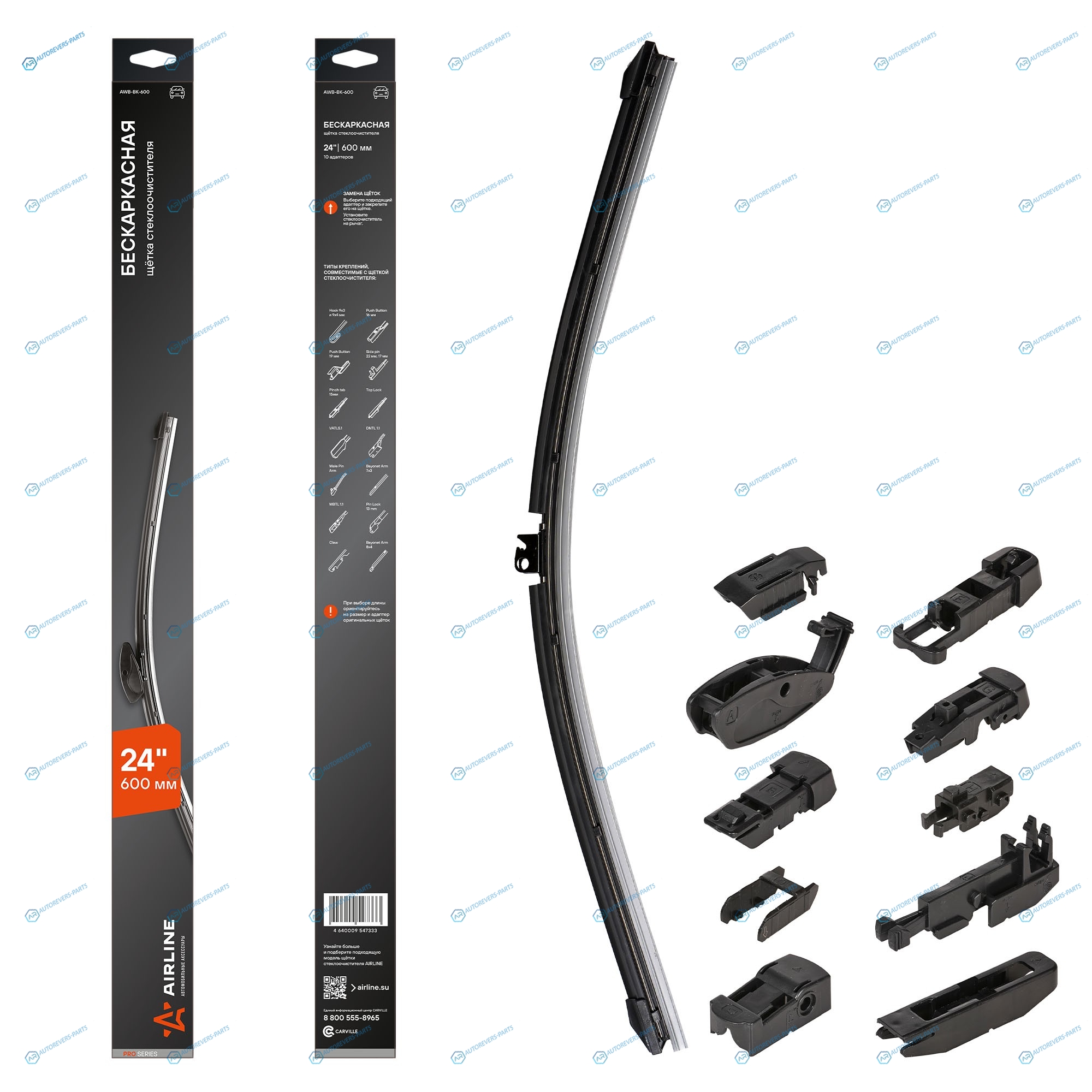 AWB-BK-600 Щетка стеклоочистителя 600 мм (24) бескаркасная. 10 адаптеров