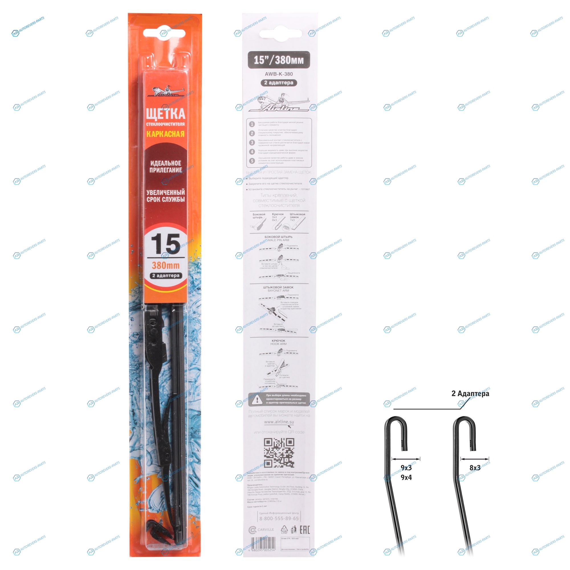 AWB-K-380 Щетка стеклоочистителя 380 мм (15) каркасная. 2 адаптера